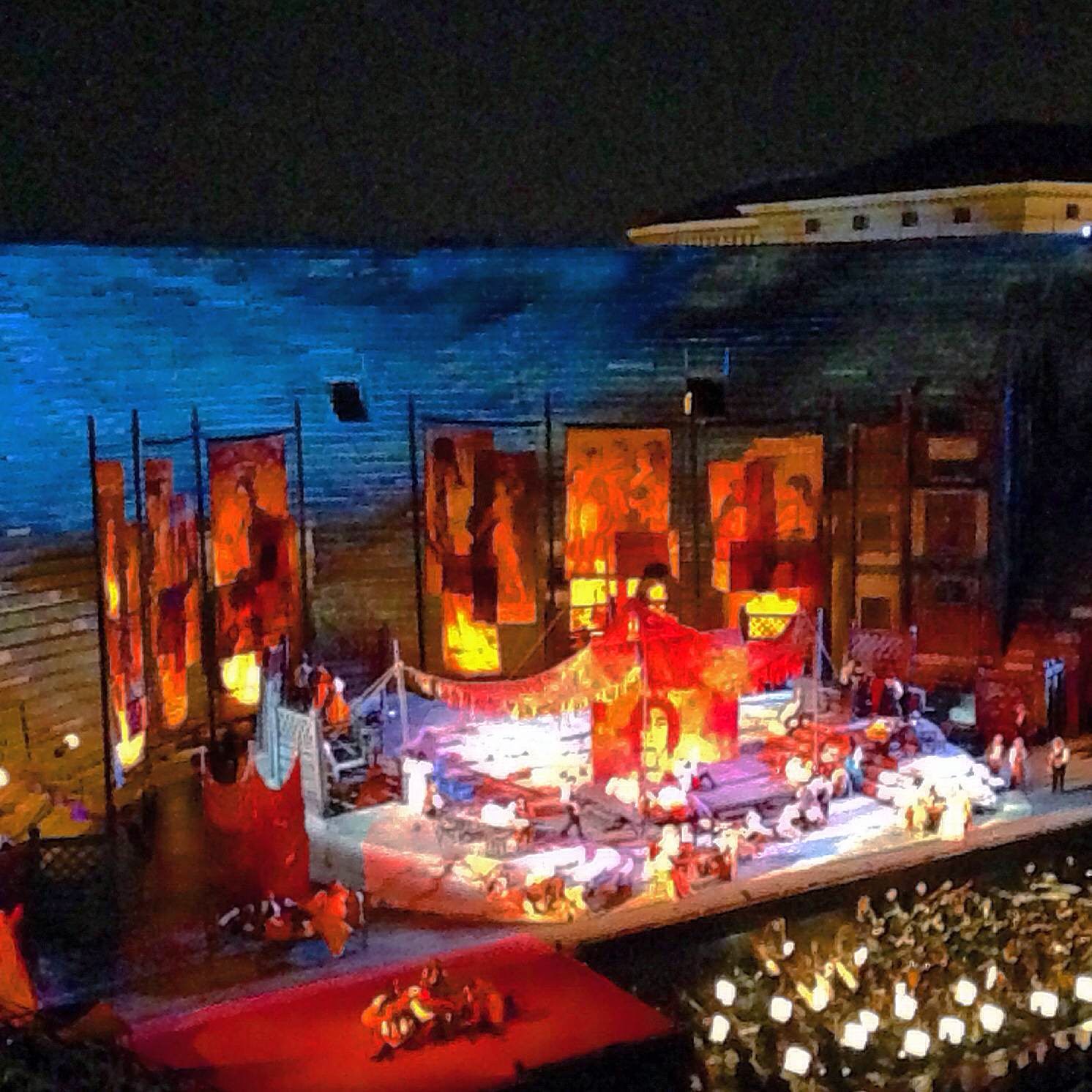 Getting into the Arena was kind of a chore. We found our numbered gate and entered the throng of people slowly making way upstairs. It was hot, crowded, smelly, and full of rude tourists. When we made it to the seating area, our "designated" area was full so we had to go over a section or two. Next time, we will definitely splurge for numbered seats. We ended up sitting on the stone benches with people crammed against our knees and backs. I had every intention of bringing pillows and blankets, but somehow left home without those AND without my binoculars, though fortunately I remembered water. Did I mention it was hot? Probably about 80 degrees, plus we were packed in tightly with everyone else. Many people brought snacks and wine, so I'm going to remember that for next time.Once the sun set, we got a little bit of a breeze, but it was still very uncomfortable. I had to shift my weight every few minutes to keep my butt from going to sleep on the stone, and I desperately wanted to kick the German asshole sitting in front of me who wanted to use my knees as a backrest. Still, it was worth it. They took an intermission after every act that was at least 20 minutes long, so it was a very long show. We didn't stay until the end because our backs were hurting, but kudos to all the people who did! I'm sure I will get a chance to go back one day. Verona seemed to be a beautiful and interesting city, and I would definitely like to spend some more time there in the near future, even if it's not for an opera.